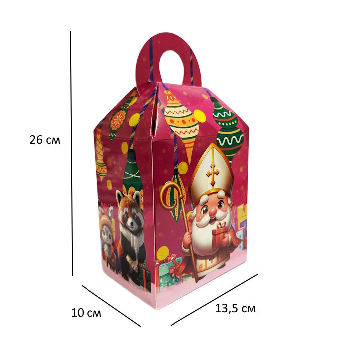 Новорічна коробка “Святий Миколай” — святкове пакування з яскравим зображенням улюбленого зимового персонажа. Така коробка ідеально підходить для дитячих подарунків, солодощів чи святкових наборів. Виготовлена з щільного картону, має зручну форму та барвистий дизайн, який створює атмосферу казки та радості.