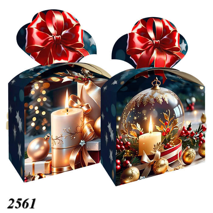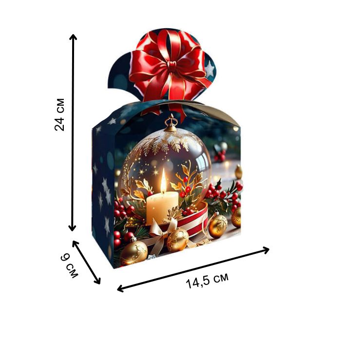 Ця новорічна коробка має елегантний дизайн із святковими свічками та золотими прикрасами. Ідеально підходить для подарунка на новорічні свята, вміщуючи до 500 г солодощів.