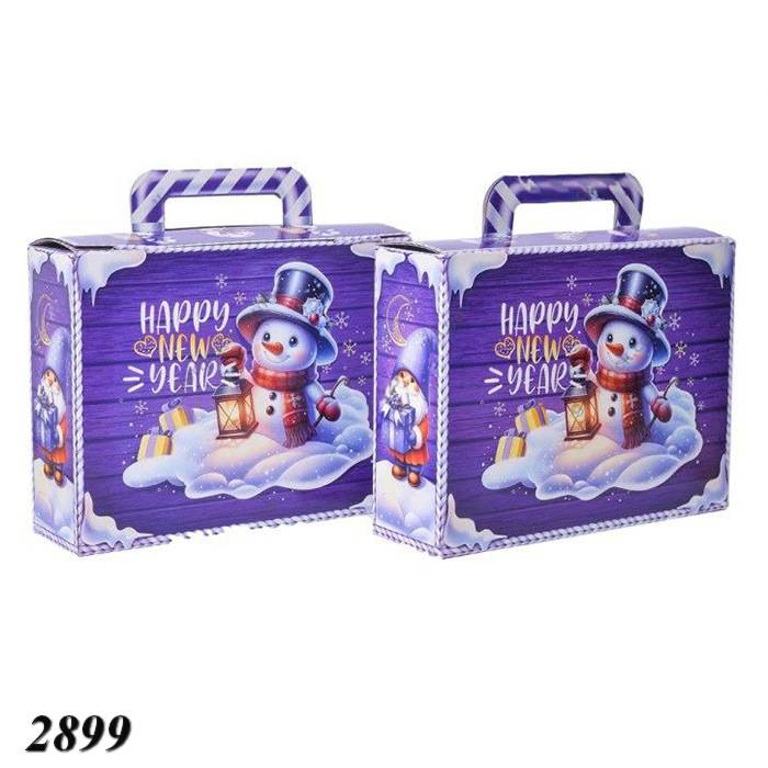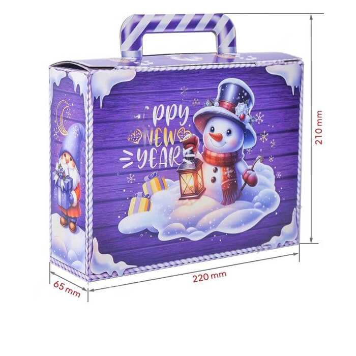 Коробка у вигляді валізки з яскравим зображенням сніговика та написом "Happy New Year" на фіолетовому тлі. Вона додає святкової атмосфери і буде чудовою упаковкою для солодощів.