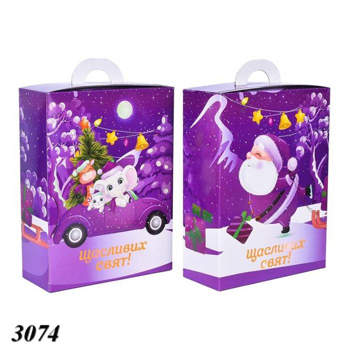 Фіолетова коробка з написом "Щасливих свят!" та малюнком Санти.