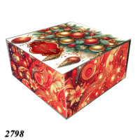 Чудова новорічна коробка для цукерок квадратної форми з розкішним червоним орнаментом і зображенням золотих та червоних кульок на кришці. Декорована святковими елементами, ця коробка стане стильним пакуванням для новорічних подарунків.