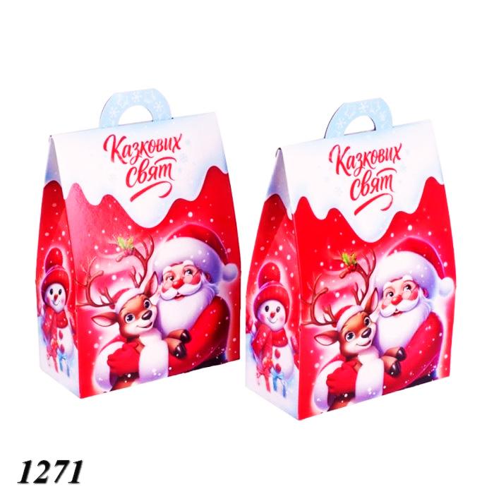 Яскрава новорічна коробка-сумка червоного кольору для солодких подарунків до свят. Місткість — до 600 г цукерок. Зручна ручка для перенесення, щільний картон та святковий дизайн створять радісний настрій для дітей і дорослих. Ідеально підходить для корпоративних та сімейних подарунків.