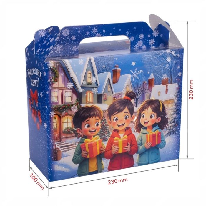 Новорічна коробка «Саквояж» з ручками та малюнком Святого Миколая, розрахована на 1500 г цукерок. Виконана зі щільного картону, має зручні ручки для перенесення та яскравий святковий дизайн у зимовій тематиці. Ідеально підійде для дитячих, сімейних і корпоративних подарунків.