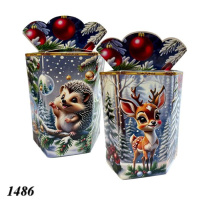 Новорічна коробка «Їжачок та олень» для солодких подарунків вагою до 800 г. Яскравий святковий дизайн із зображенням казкових тварин створює зимову атмосферу. Коробка виготовлена з міцного картону, зручна у використанні та надійна для подарунків.