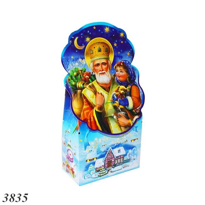Для створення казкового подарунка підійде новорічна упаковка Святий Микола, вона виготовлена з високоякісного глянцевого картону, на який нанесено яскравий повноколірний новорічний малюнок. Така новорічна коробка має пірамідальну форму та об’єм 500 грам.