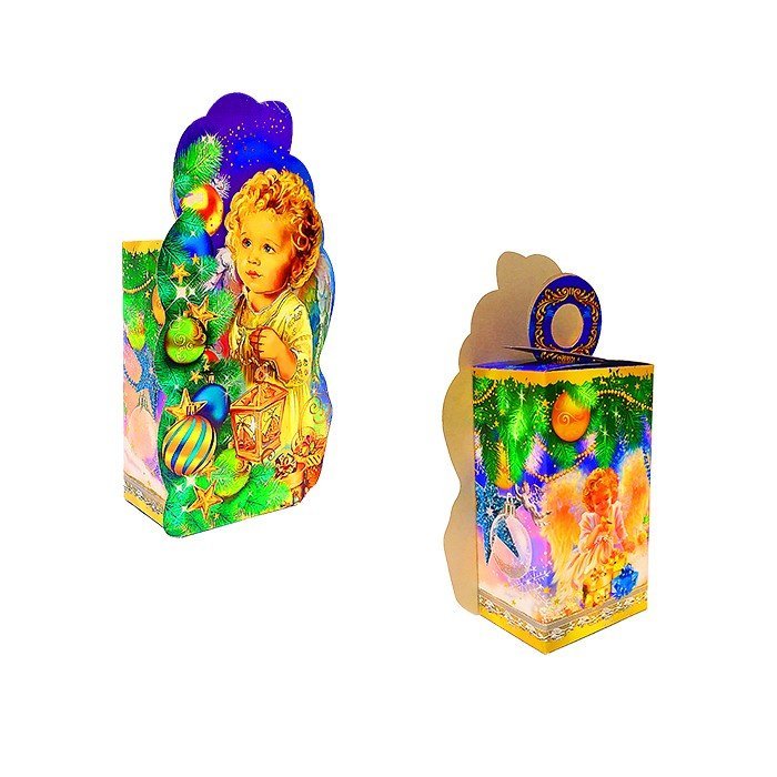 Для створення казкового подарунка підійде новорічна упаковка Янгол, вона виготовлена з високоякісного глянцевого картону, на який нанесено яскравий повноколірний новорічний малюнок. Така новорічна коробка має прямокутну форму та об’єм 600 грам.