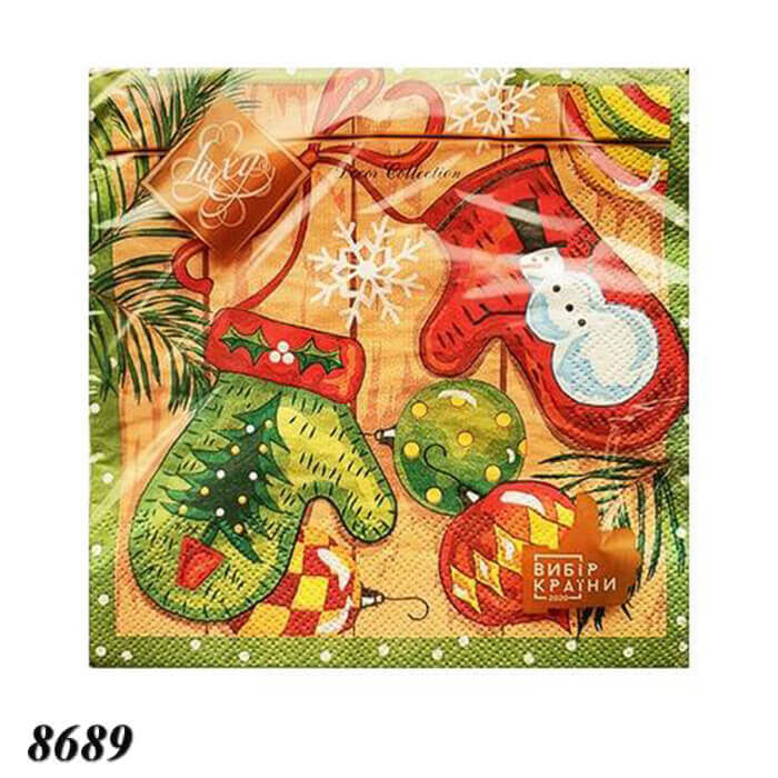 Серветки новорічні Luxy "Новорічні Рукавички", призначені для сервірування новорічного столу та обслуговування клієнтів в готельно-ресторанній сфері та кав’ярнях.