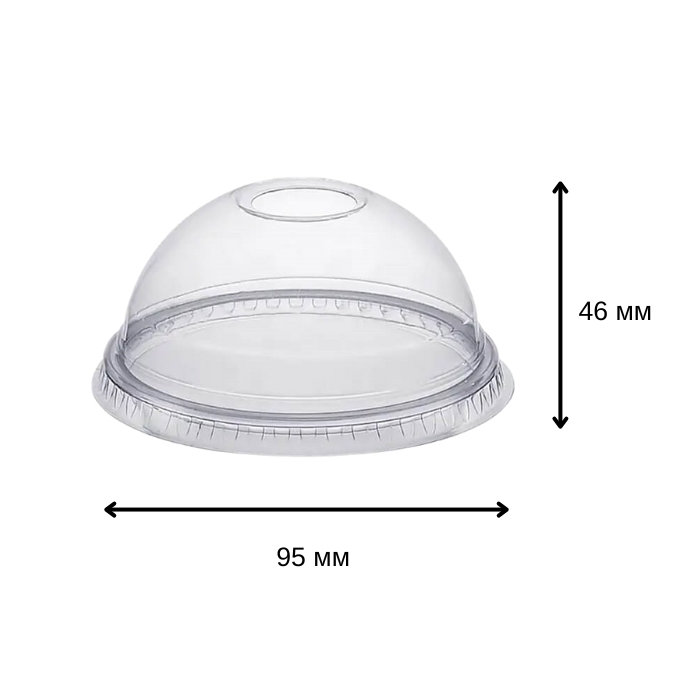 Купольна кришка з отвором діаметром 95 мм призначена для коктейльних пластикових стаканів. Завдяки високій купольній формі ідеально підходить для подачі десертів, морозива, фруктів та напоїв із «топінгом» або «шапкою» (вершки, пінка тощо). Щільно закриває стакан, захищаючи вміст від проливання та забруднень. Виготовлена з прозорого харчового пластику, безпечного для контакту з їжею.