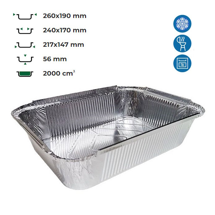 Алюмінієвий контейнер 2000 мл — це зручна одноразова тара для приготування, зберігання, запікання та транспортування гарячих і холодних страв. Контейнер виготовлений з харчової алюмінієвої фольги, яка стійка до високих температур, не змінює смак продуктів і підходить для духовок, грилів та морозильних камер. Ідеально підходить для HoReCa, кейтерингу, доставки їжі, а також побутового використання.