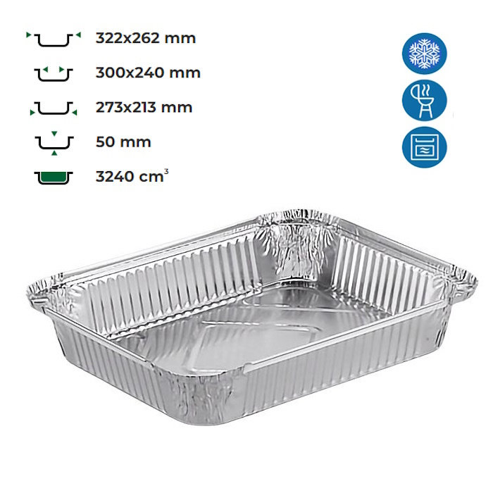 Алюмінієвий контейнер 3240 мл — це зручна одноразова тара для приготування, зберігання, запікання та транспортування гарячих і холодних страв. Контейнер виготовлений з харчової алюмінієвої фольги, яка стійка до високих температур, не змінює смак продуктів і підходить для духовок, грилів та морозильних камер. Ідеально підходить для HoReCa, кейтерингу, доставки їжі, а також побутового використання.