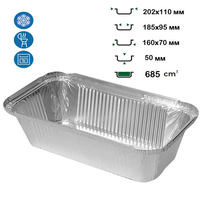 Алюмінієвий контейнер 685 мл — це зручна одноразова тара для приготування, зберігання, запікання та транспортування гарячих і холодних страв. Контейнер виготовлений з харчової алюмінієвої фольги, яка стійка до високих температур, не змінює смак продуктів і підходить для духовок, грилів та морозильних камер. Ідеально підходить для HoReCa, кейтерингу, доставки їжі, а також побутового використання.