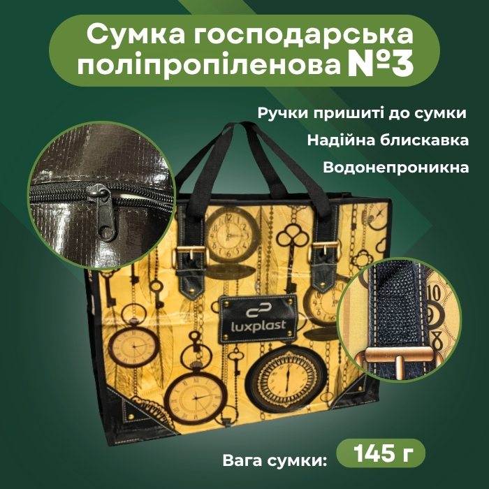 Хозяйственная сумка Альфа №3 Часы — компактная и удобная сумка для ежедневного использования. Благодаря размеру 47x41x19 см идеально подходит для покупок, транспортировки вещей или хранения. Изготовлена из прочного ламинированного полипропилена, который устойчив к влаге и износу. Дизайн с изображением часов придает стильный вид. Усиленные ручки обеспечивают комфорт даже при погрузке.