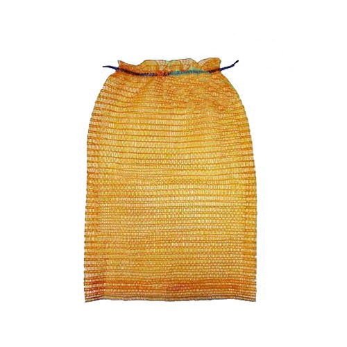 Овощная сетка оранжевого цвета, выглядит как мягкий сетчатый мешок с завязкой на горловине.