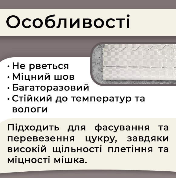 Прочные полипропиленовые мешки 40х55 см, плотностью 62 г/м2, оптимальны для упаковки сахара до 10 кг. Внутреннее ламинирование препятствует проникновению пыли и влаги, а усиленные края с двумя швами обеспечивают долговечность даже при многократном открывании. Благодаря широкой прорезной ручке мешок удобно держать и переносить даже при максимальной загрузке.