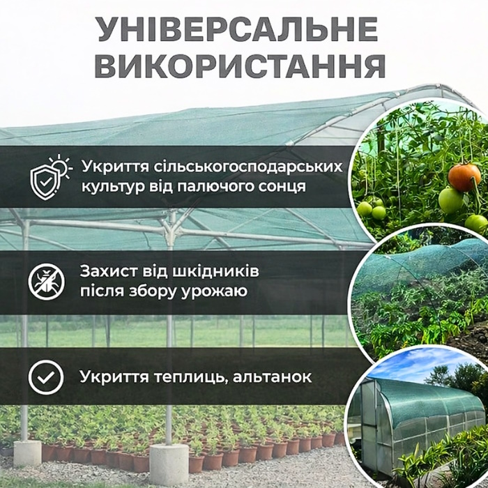 - Снижение температуры: сетка снижает температуру воздуха на 5-10 °C, предотвращая перегрев растений и помогая им лучше развиваться.- Экономия воды: замедляет испарение влаги из почвы, сокращая количество необходимых поливов.