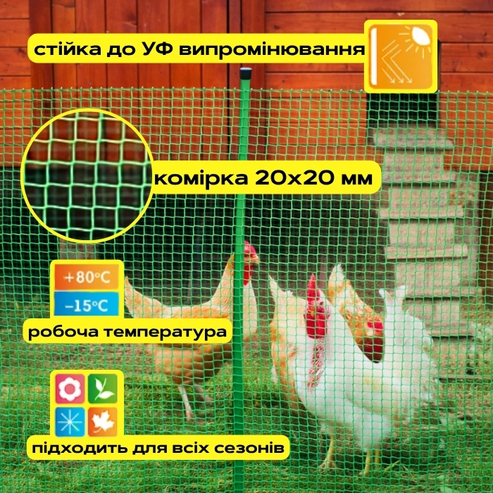 Защитная пластиковая сетка с ячейкой 20х20 мм предназначена для содержания цыплят и другой мелкой птицы. Благодаря оптимальному размеру ячейки обеспечивает безопасность молодняка, предотвращая его выход и защищая от хищников. Изготовлена из прочного полимерного материала, устойчивого к влаге, ультрафиолету и перепадам температур. Сетка легко монтируется, имеет небольшой вес и подходит для использования как в помещении, так и на открытом воздухе. Идеальное решение для фермерских хозяйств, птицеферм и частных подворий.