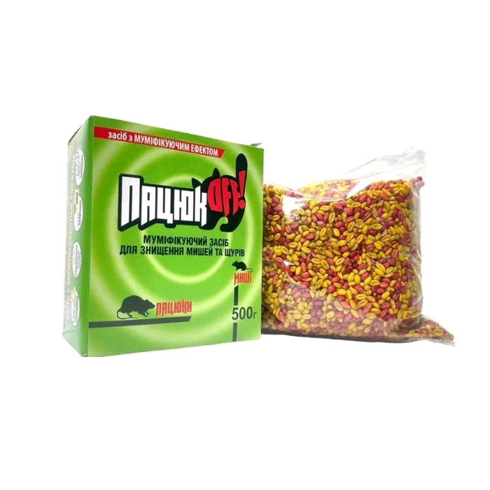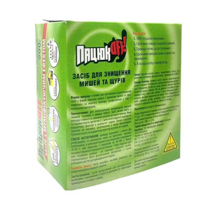 Зерновая приманка с ароматом арахиса и сыра, красного и желтого цвета Крыса OFF применяется для уничтожения крыс и мышей в жилых и нежилых помещениях, на предприятиях, в медицинских учреждениях, хранилищах и на приусадебных участках. Крыса OFF содержит в составе действующее вещество – бродифакум. Попадая в организм животного этот синтетический антикоагулянт крови нарушает образование витамина K1, необходимого для развития белков протромбинового комплекса. Через одни сутки после употребления препарата у грызуна резко снижается уровень свертывания крови. В результате любое повреждение грызуна приводит к внутреннему кровотечению и гибели животного в течение 1-7 дней. Из-за отсроченного действия родентицида у грызунов не возникает резко выраженных симптомов отравления, что не вызывает подозрения и реакции страха приманки у других особей. Средство имеет в составе приманивающие ароматизаторы и вкусовые компоненты, а также мумификатор, который избавит от неприятного запаха погибших грызунов.