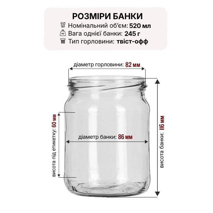 Цилиндрическая банка объемом 520 мл с классическим венчиком ТО 82 мм – надежная посуда для домашней и промышленной консервации. Прозрачное пищевое стекло позволяет контролировать цвет и плотность содержимого, а ровные стены обеспечивают аккуратную наклейку этикеток. Выдерживает многократную стерилизацию и пастеризацию, поэтому хорошо подходит для джемов, варенья, соусов, меда, тушенки и других заготовок.