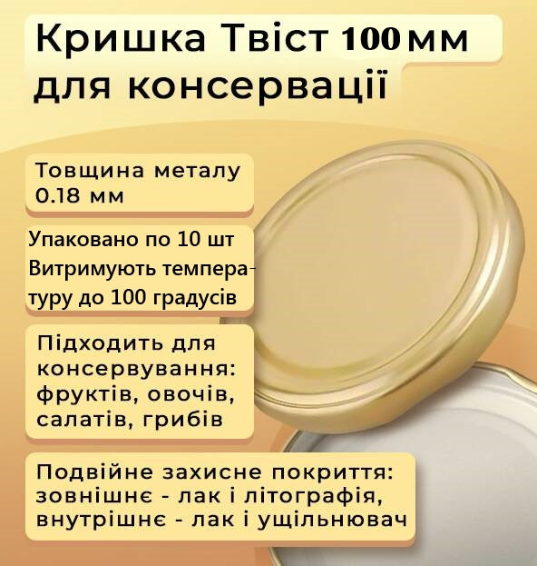Металлические ЕВРО крышки диаметром 100 мм — изготовлены из стали с внутренним полимерным покрытием (пищевая эмаль), что обеспечивает защиту продуктов от контакта с металлом и продлевает срок хранения. Тип закручивания – твист-оф, позволяющий герметично закрывать банки вручную без дополнительных инструментов. Имеет клапан, обеспечивающий контроль герметизации: воздух выходит при нагревании, а после охлаждения втянутая мембрана указывает на вакуум. Идеально подходят как для бытовой консервации, так и для промышленной упаковки в оптовых объемах. Крышка выдерживает температуру до 100 °C.