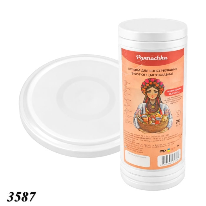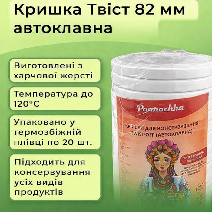 Металлические ЕВРО крышки «Панночка» Белые Автоклавные диаметром 82 мм — изготовлены из стали с внутренним полимерным покрытием (пищевая эмаль), что обеспечивает защиту продуктов от контакта с металлом и продлевает срок хранения. Тип закручивания – твист-оф, позволяющий герметично закрывать банки вручную без дополнительных инструментов. Имеет клапан, обеспечивающий контроль герметизации: воздух выходит при нагревании, а после охлаждения втянутая мембрана указывает на вакуум. Идеально подходят как для бытовой консервации, так и для промышленной упаковки в оптовых объемах. Крышка выдерживает температуру до 120 °C.