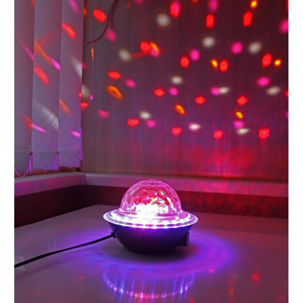 Лазер диско CY-6740 UFO имеет вид кристального магического шара с автоматической сменой цветов, за которые отвечают 6 LED ламп разного цвета. Такой диско шар работает от сети 220V и подключается по Bluetooth, а также проигрывает музыку с флешки.