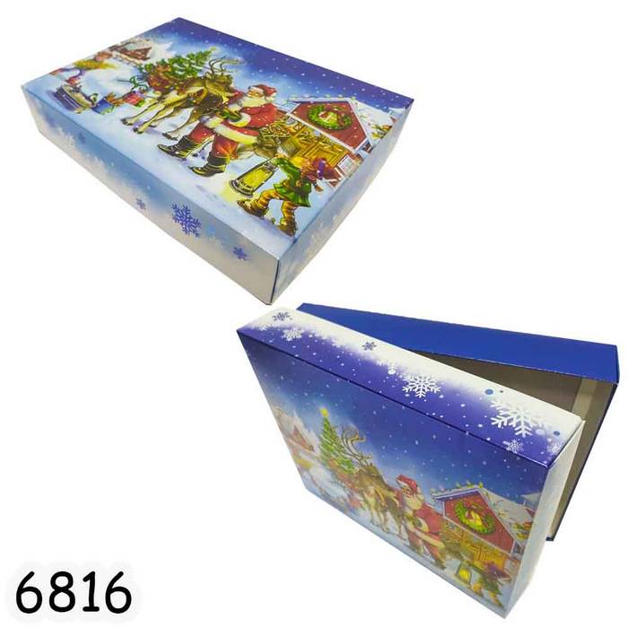 Эта плоская прямоугольная коробка с крышкой имеет праздничный дизайн с Сантой, оленями и снежинками. Яркий и подробный рисунок придает атмосфере праздничное настроение. Коробка идеально подходит для хранения больших наборов сладостей или других подарков. Вмещает до 800 г сладостей.