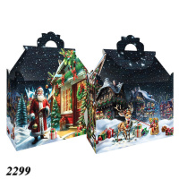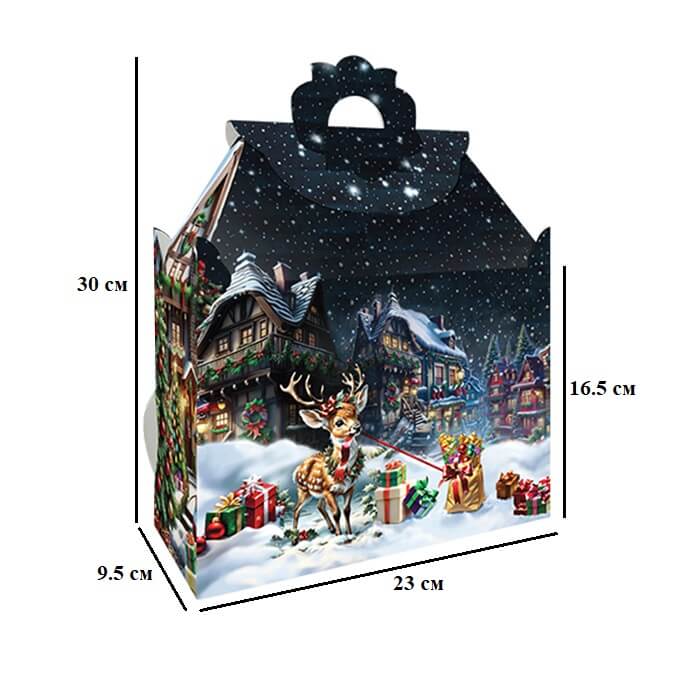 Коробка с классическим изображением Санта-Клауса и праздничные улочки в зимнюю ночь. Идеально подходит для новогоднего подарка и вмещает до 1000 г. конфет.