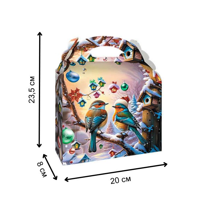 Великолепная новогодняя коробка с изображением милых зимних птичек, сидящих на ветках, украшенных яркими шариками. Идеальный выбор для подарка к зимним праздникам, создавая теплую и уютную атмосферу. Вмещает до 800 г конфет.