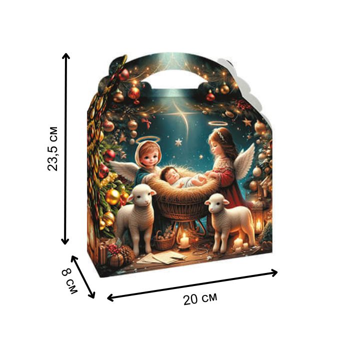 Эта коробка с праздничным изображением ангелов у яслей создает особую рождественскую атмосферу. Вмещает до 800 г сладостей. Идеальный выбор для подарка на Рождество.