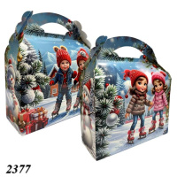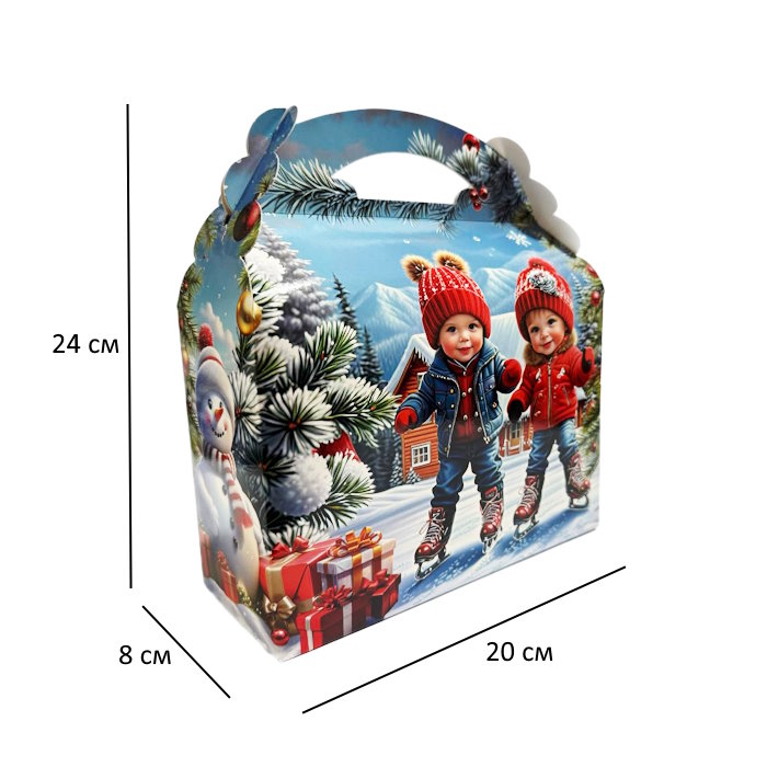 Новогодняя коробка "Дети на коньках" - праздничная упаковка с красочным зимним сюжетом. На изображении дети в теплых шапках катаются на коньках среди заснеженных елей и снеговика. Прочный картон выдерживает вес сладостей, а удобная ручка делает коробку практичной для переноски. Идеально подходит для подарков, сувениров или сладких наборов.
