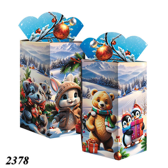 Веселые персонажи на зимнем фоне: мишка, кролик и пингвины с подарками. Коробка подойдет для детского подарка и вмещает до 800 г сладостей.