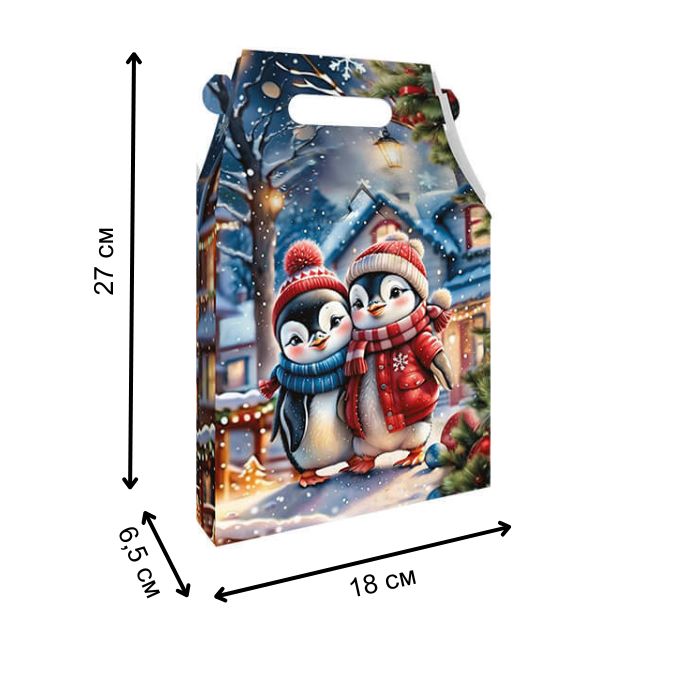 Новогодняя подарочная коробка "Пингвины" – яркая праздничная упаковка для сладостей и маленьких подарков. Выполнена из крепкого картона с изображением милых пингвинов в зимнем антураже, что создает веселое и теплое настроение. Идеально подходит для подарков на Рождество и Новый год.