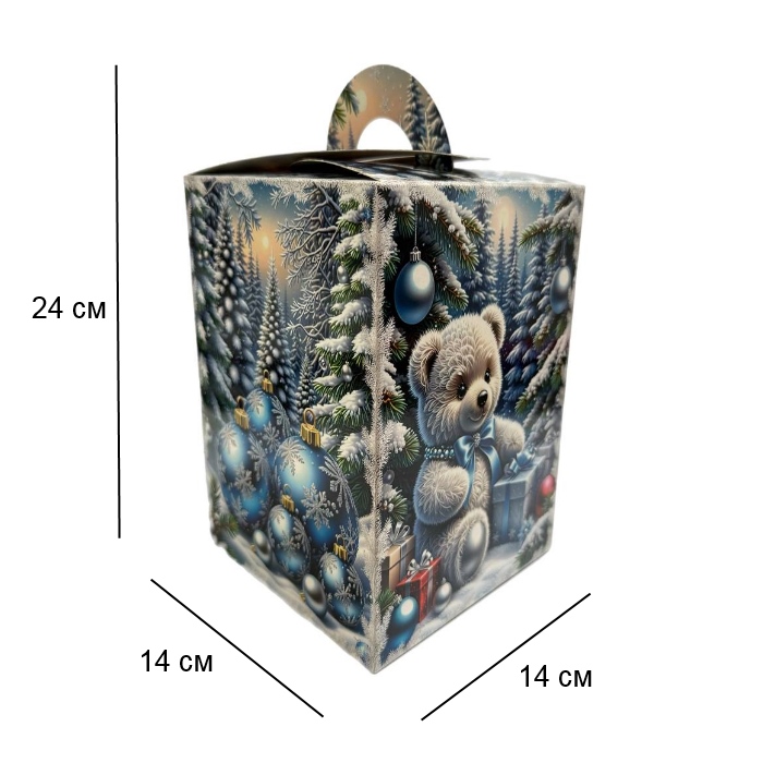 Новогодняя подарочная коробка рассчитана на фасовку до 1000 г сладостей. Изготовлен из плотного картона, имеет удобную ручку для переноски и яркий праздничный дизайн. На гранях коробки изображены зимние сюжеты — мишка, снеговик, елки, игрушки и фонарь в сине-серебристой гамме. Такая упаковка делает подарок особенным и создает новогоднюю атмосферу.