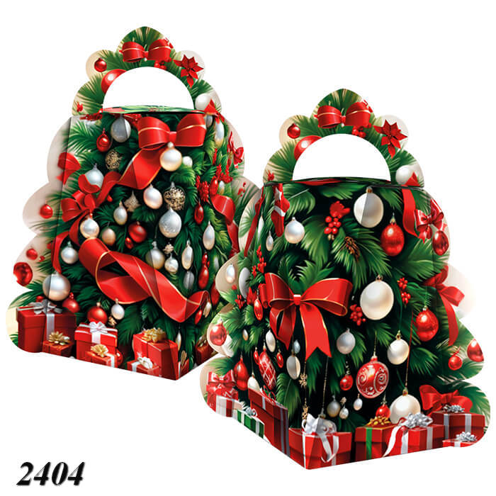 Эта праздничная коробка в виде елки украшена красными бантами и шарами. Идеально подходит для новогодних подарков, вмещая до 1000 г конфет.
