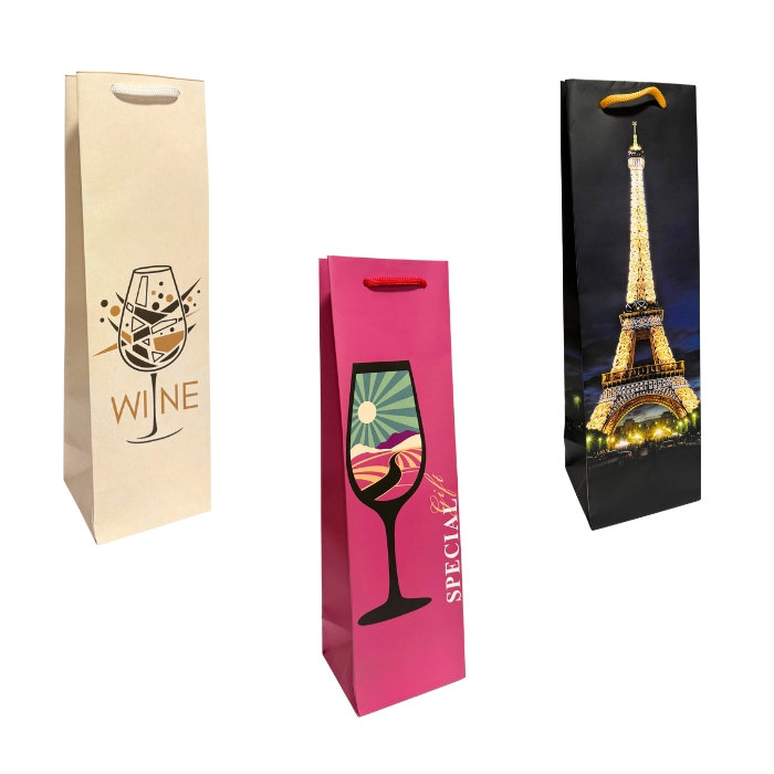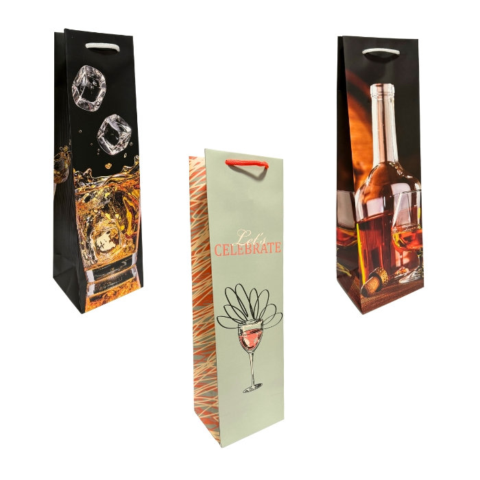 Пакет имеет хорошее тематическое или универсальное изображение. Прекрасно подойдет для упаковки бутылки вина или шампанского. В упаковке пакеты разных дизайнов.