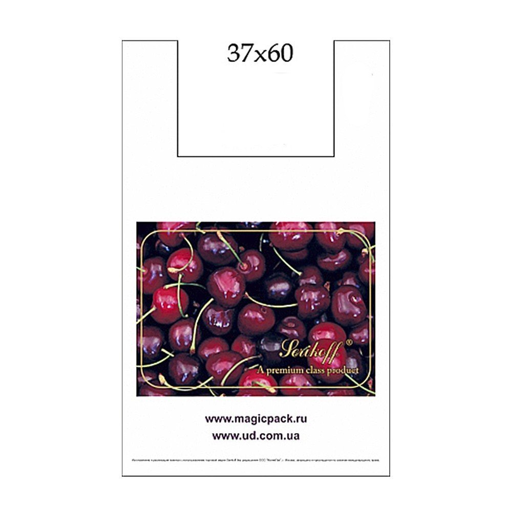 Размер пакетов майка Serikoff с рисунком "Вишня" составляет 37 см шириной и 60 см длиной.